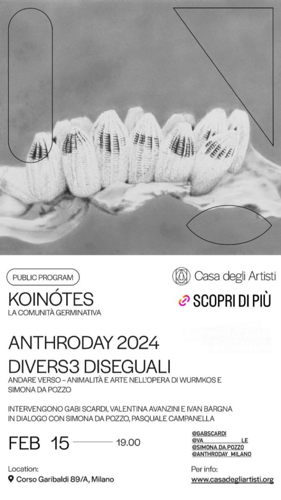 A proposito di rapporti di specie alternativi, il 15 febbraio, ore 19, racconterò De Bruchis a Casa degli Artisti di Milano nell’ambito di Anthroday 2024 in collaborazione con Anjmot Magazine – Divers3 diseguali– Andare verso: Animalità e arte nell’opera di Wurmkos e Simona da Pozzo. Con: Gabi Scardi, Valentina Avanzini, Ivan Bargna in dialogo con Simona Da Pozzo e Pasquale Campanella.