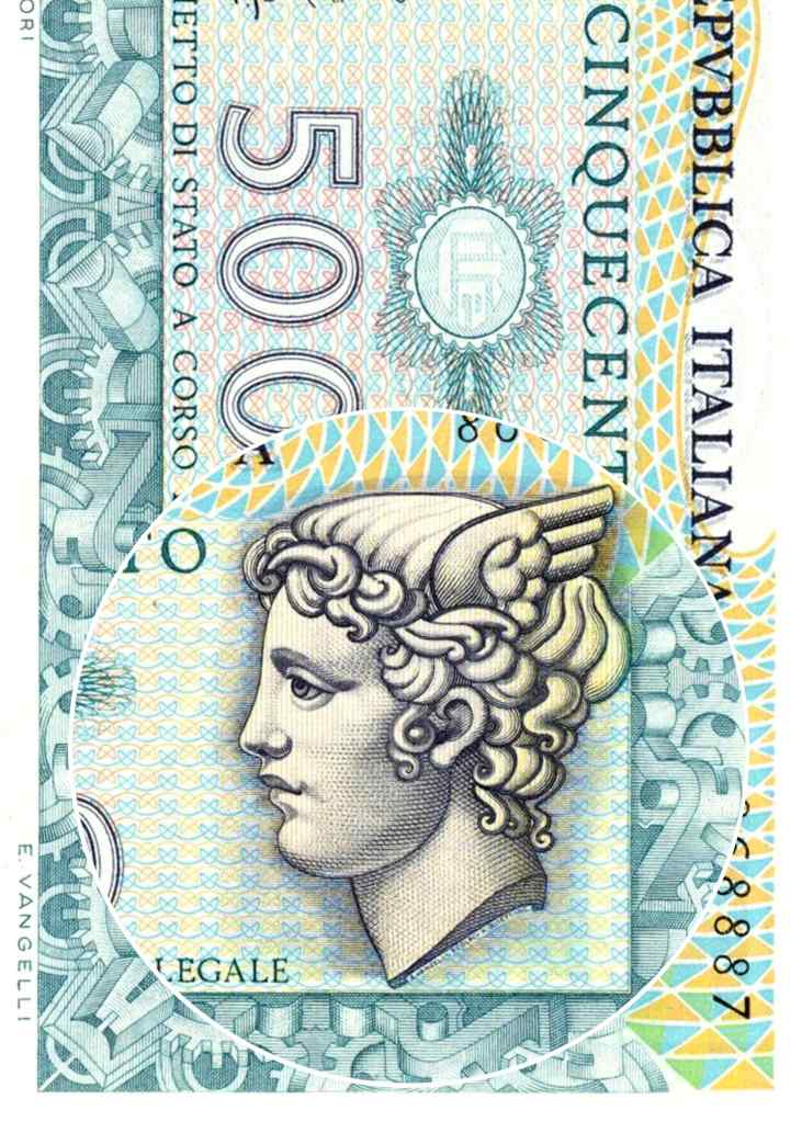 Digital print on banner of the detail of a modified banknote with the winged head of the god Hermes/Mercury rotated 90°.