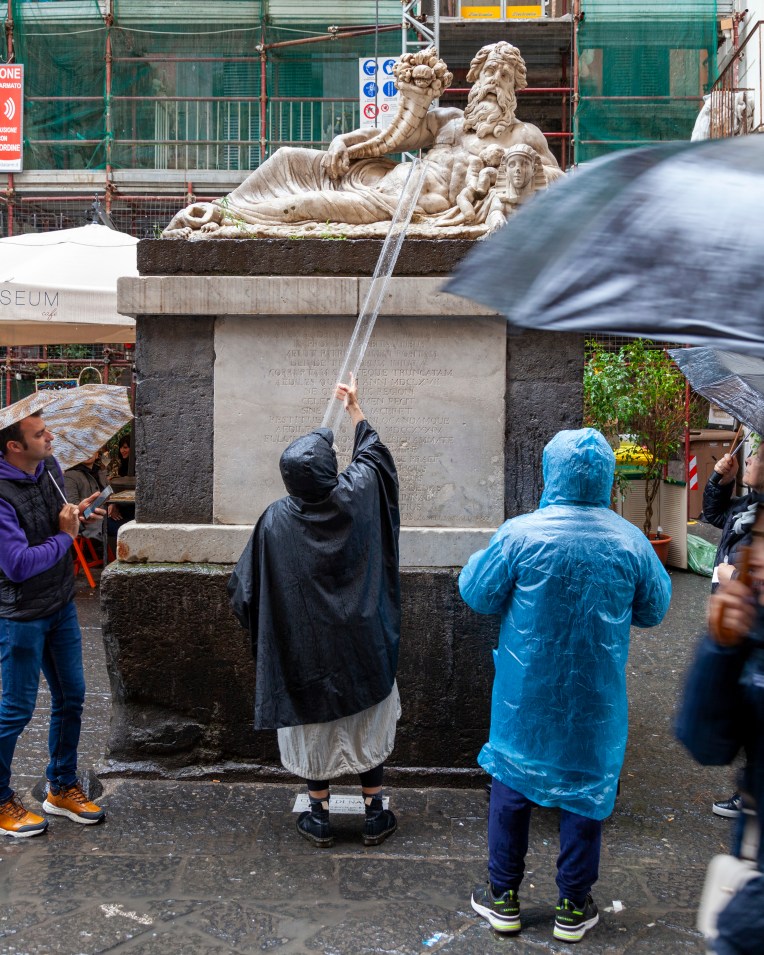 The action produced a peculiar behaviour among the passers-by: some of them, during the performative action, collected the water dripped from the monument with their own hands and did face-flows.