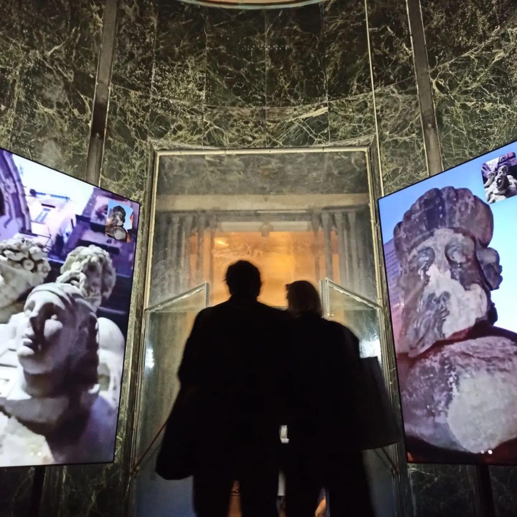In the installation Sunrise Gods’Call, the dialogue between the two monuments is nourished by these sound documents, this urgency. It invites viewers into a time loop where a short sound utopia (aka relational dystopia) flows.